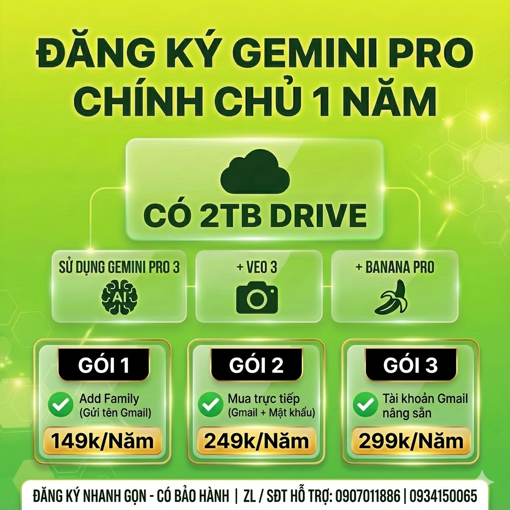 Chỉ 20k/tháng sở hữu Gemini 3 Pro & Google Antigravity. Tiết kiệm 95% chi phí, hỗ trợ Code, CI/CD, 2TB Drive. Cam kết: Cài đặt nâng cấp xong xuôi, kiểm tra tài khoản ok mới thu phí!